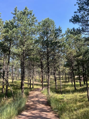 Join Amy for a square-shaped loop in the Black Forest, north of Colorado Springs. The trail is a fairly wide gravel path with very little elevation change. The area is heavily forested providing shade during the hike.